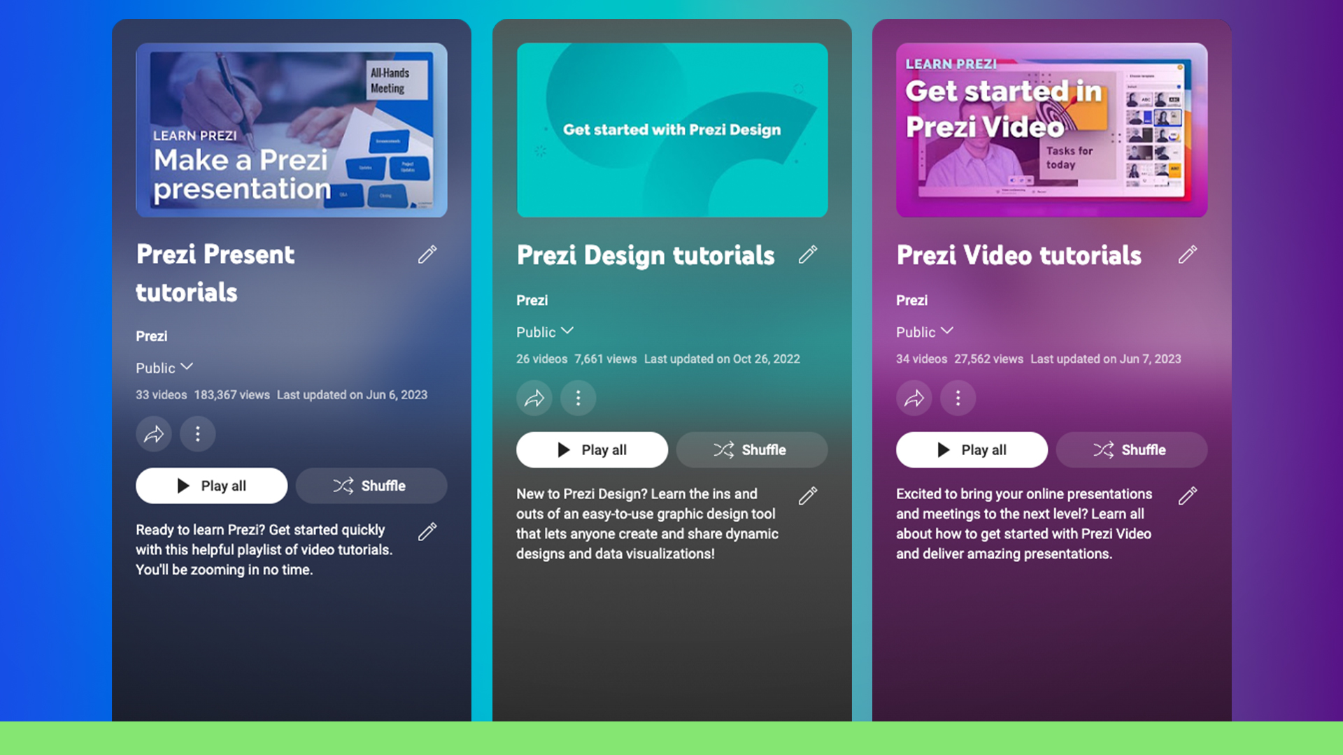 The ins and outs of Prezi Video. These how-to videos show you how to create your first video, make edits, share it with the world, and more.